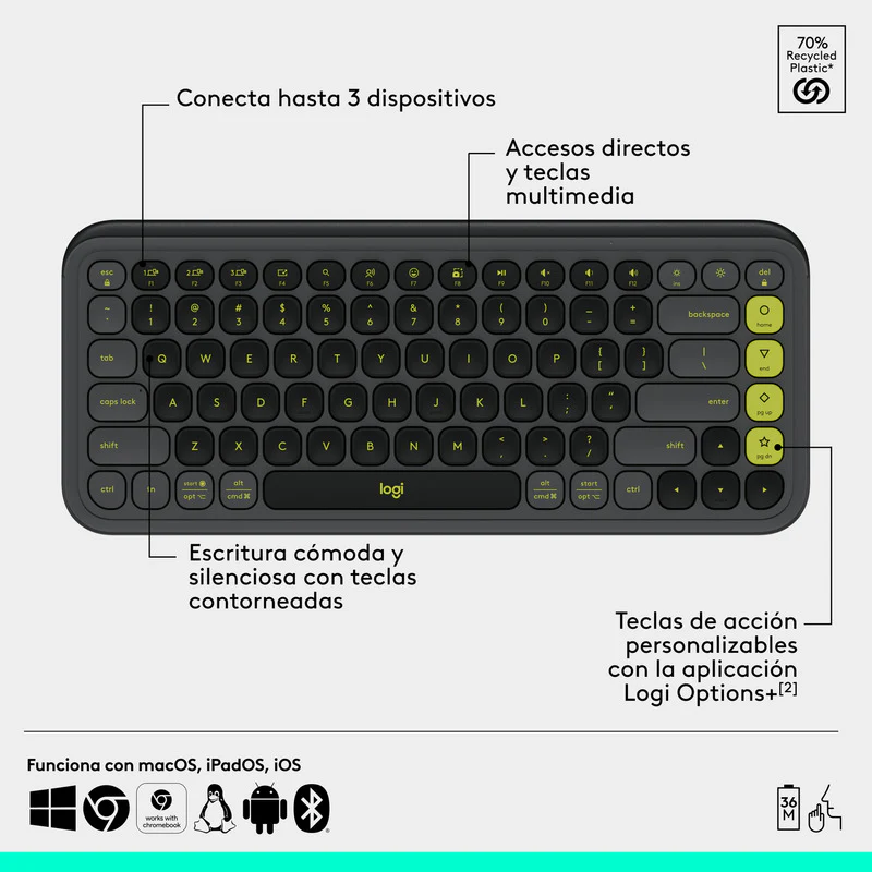Las teclas suaves y de perfil bajo del teclado inalámbrico están diseñadas para una escritura precisa, cómoda y discreta. El suave contorno de POP Mouse se adapta perfectamente a la palma de la mano y el ruido de SilentTouch Technology. Nivel de dBA de clic con el botón izquierdo medido por un laboratorio independiente a 1 metro. hace que cada clic sea silencioso.