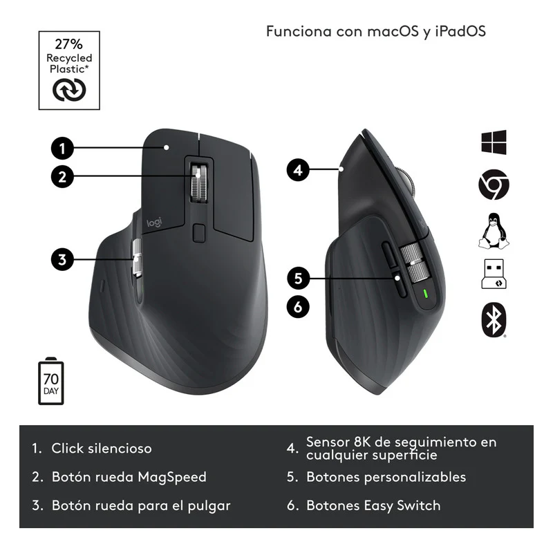 MX Master 3S es compatible con la mayoría de sistemas operativos. Las funciones básicas de los dispositivos se admitirán sin software para sistemas operativos distintos de Windows y macOS inmediatamente como Windows, macOS, Chrome OS o Linux. El mouse se empareja al instante con hasta tres dispositivos por Bluetooth de bajo consumo o el receptor USB Logi Bolt incluido No compatible con la tecnología Logitech Unifying.